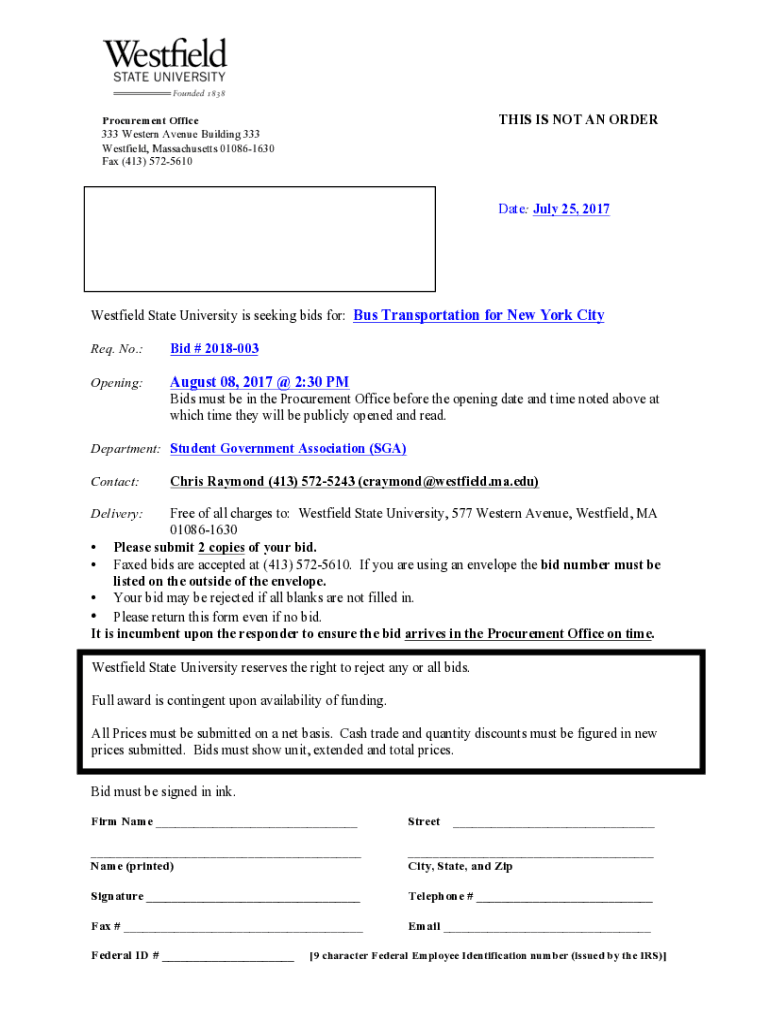 THIS IS NOT AN ORDERProcurement Office 333 Western Avenue Building 333 Westfield, Massachusetts 010861630 Fax (413) 5725610Date: July 25, 2017Westfield State University is seeking bids for: Bus Transportation
