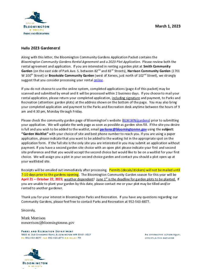 March 1, 2023Hello 2023 Gardeners! Along with this letter, the Bloomington Community Gardens Application Packet contains the Bloomington Community Gardens Rental Agreement and a 2023 Plot Application.