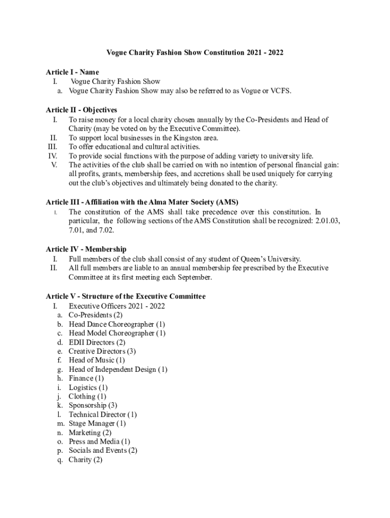 Vogue Charity Fashion Show Constitution 2021 2022 Article I Name I. Vogue Charity Fashion Show a. Vogue Charity Fashion Show may also be referred to as Vogue or CFS. Article II Objectives I. To raise