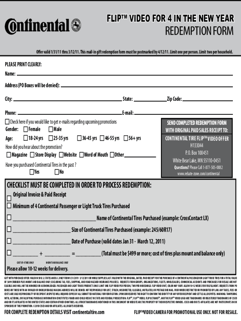 Flip video for 4 in the new yearRedemption Former valid 1/31/11 through 3/12/11. This mailing gift redemption form must be postmarked by 4/12/11. Limit one per person. Limit two per household. PLEASE