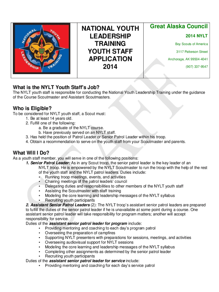NATIONAL YOUTH LEADERSHIP TRAINING YOUTH STAFF APPLICATION 2014Great Alaska Council 2014 NY LT Boy Scouts of America 3117 Patterson Street Anchorage, AK 995044041 (907) 3379547What is the NY LT Youth