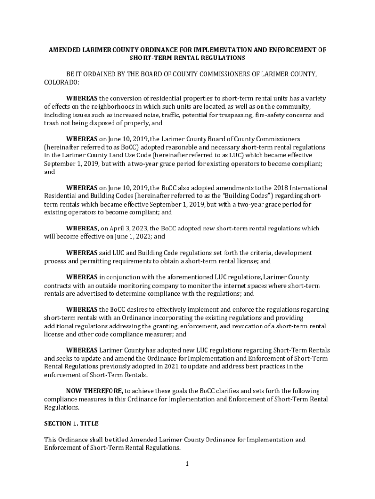 AMENDED LARIMER COUNTY ORDINANCE FOR IMPLEMENTATION AND ENFORCEMENT OF SHORTER RENTAL REGULATIONS BE IT ORDAINED BY THE BOARD OF COUNTY COMMISSIONERS OF LARIMER COUNTY, COLORADO:WHEREAS the conversion