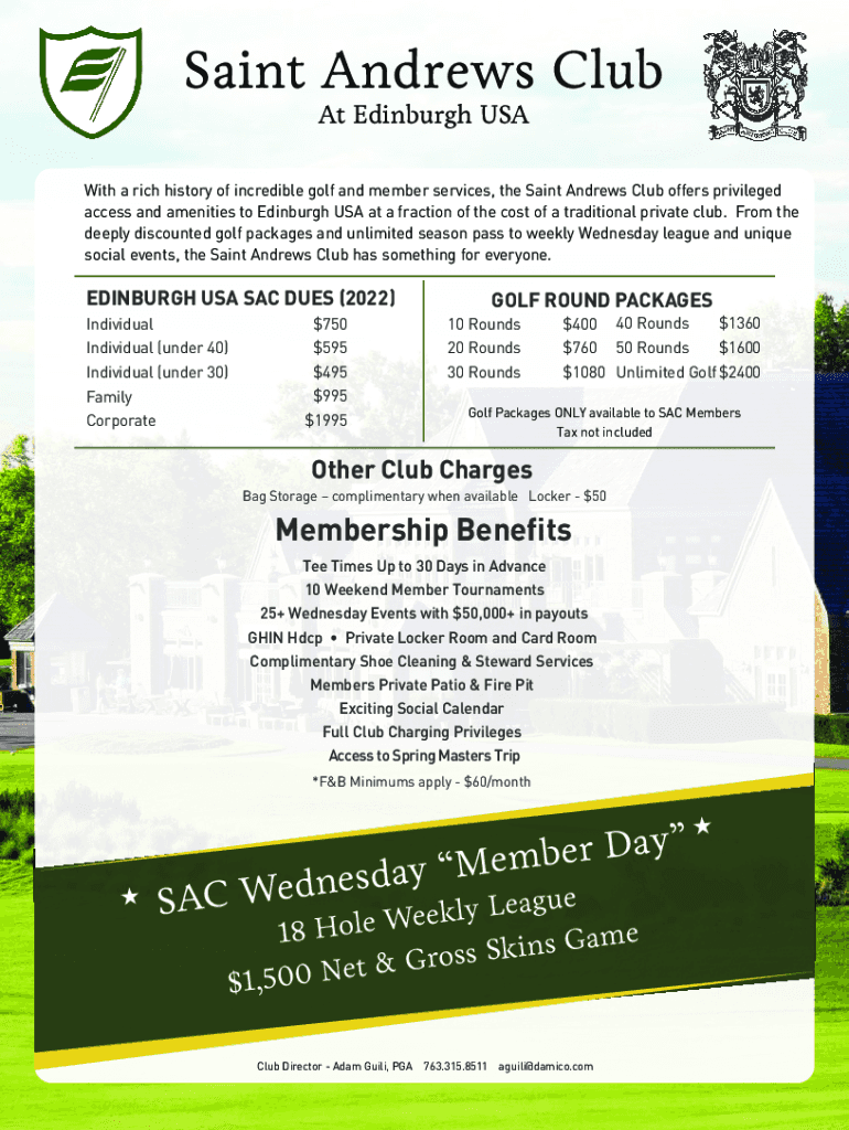 Saint Andrews Club At Edinburgh Saith a rich history of incredible golf and member services, the Saint Andrews Club offers privileged access and amenities to Edinburgh USA at a fraction of the cost