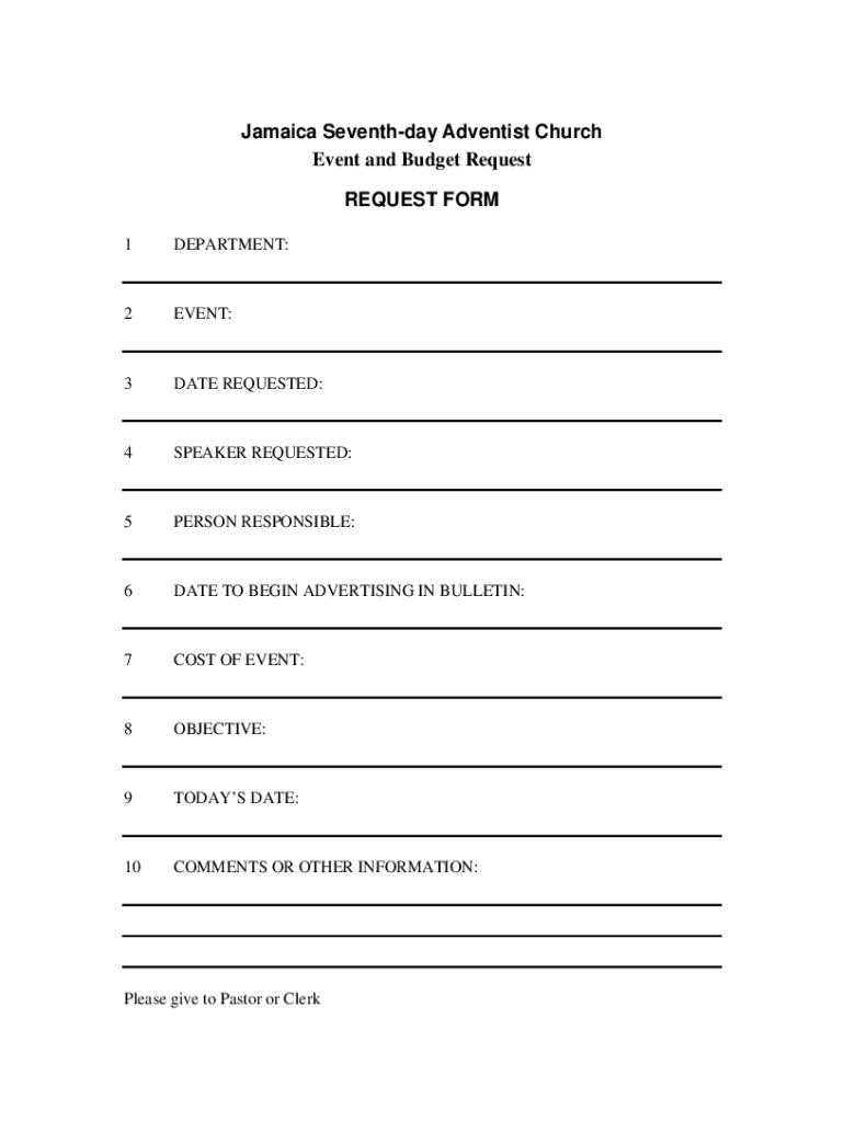 Jamaica Seventh day Adventist Church Event and Budget Request FORM 1DEPARTMENT:2EVENT:3DATE REQUESTED:4SPEAKER REQUESTED:5PERSON RESPONSIBLE:6DATE TO BEGIN ADVERTISING IN BULLETIN:7COST OF EVENT:8OBJECTIVE:9TODAYS