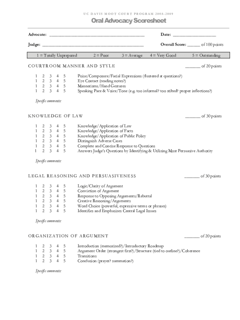 UC DAVIS MOOT COURT PROGRAM 20082009Oral Advocacy Scoresheet Advocate: ___Date: ___Judge: ___Overall Score: ___ of 100 points1 Totally Unprepared2 Poor3 Average4 Very GoodCOURTROOM MANNER AND STYLE