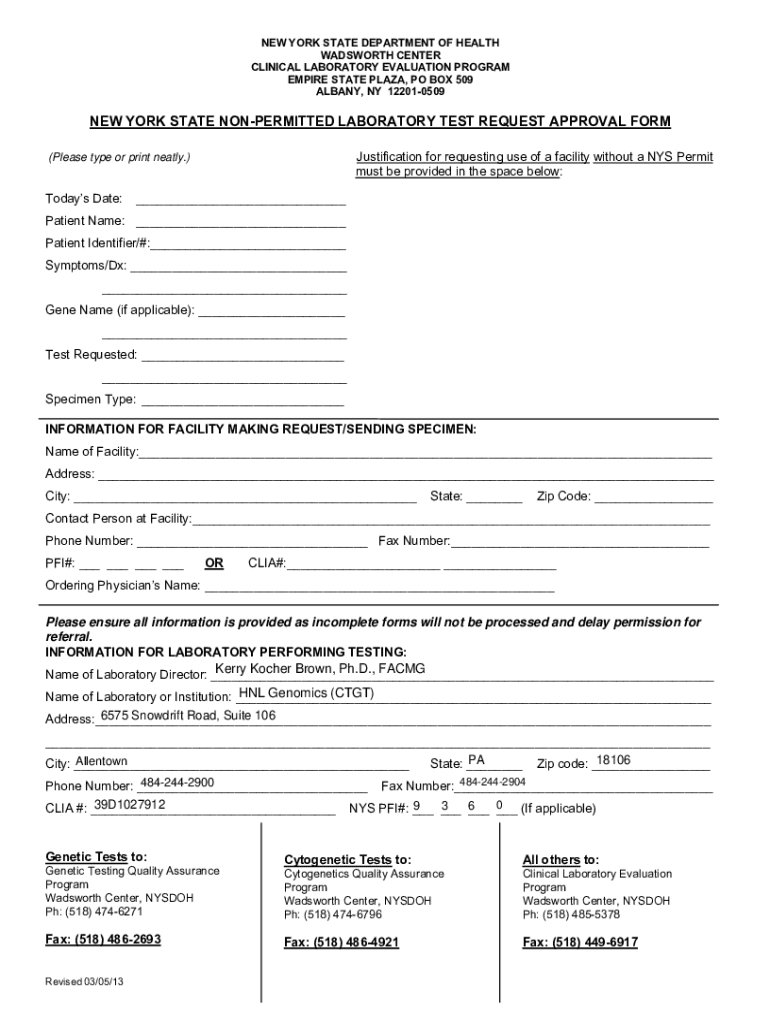 NEW YORK STATE DEPARTMENT OF HEALTH WADSWORTH CENTER CLINICAL LABORATORY EVALUATION PROGRAM EMPIRE STATE PLAZA, PO BOX 509 ALBANY, NY 122010509NEW YORK STATE PERMITTED LABORATORY TEST REQUEST APPROVAL