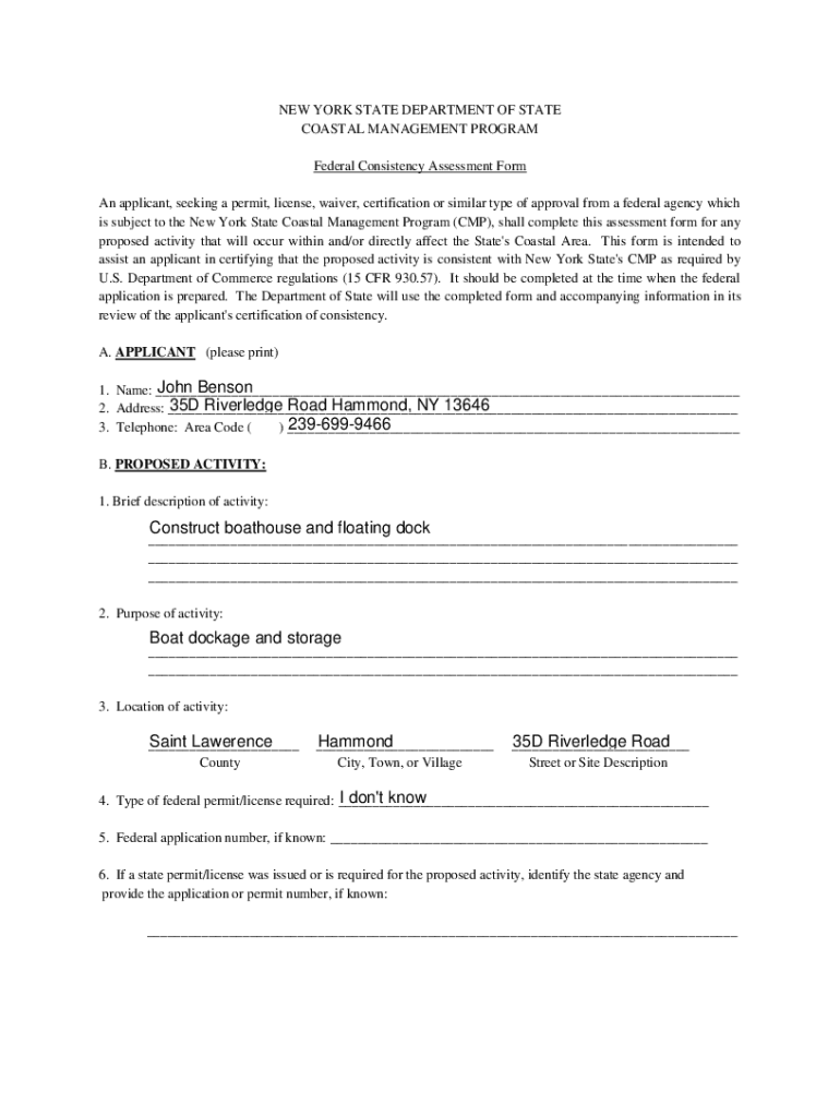 NEW YORK STATE DEPARTMENT OF STATE COASTAL MANAGEMENT PROGRAM Federal Consistency Assessment Form An applicant, seeking a permit, license, waiver, certification or similar type of approval from a