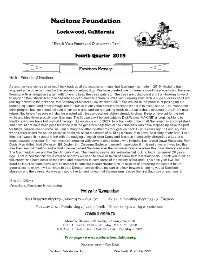 Baritone Foundation Lockwood, California Enrich Your Future and Discover the Past Fourth Quarter 2019 Presidents Message Hello, Friends of Baritone, As another year comes to an end I look back at