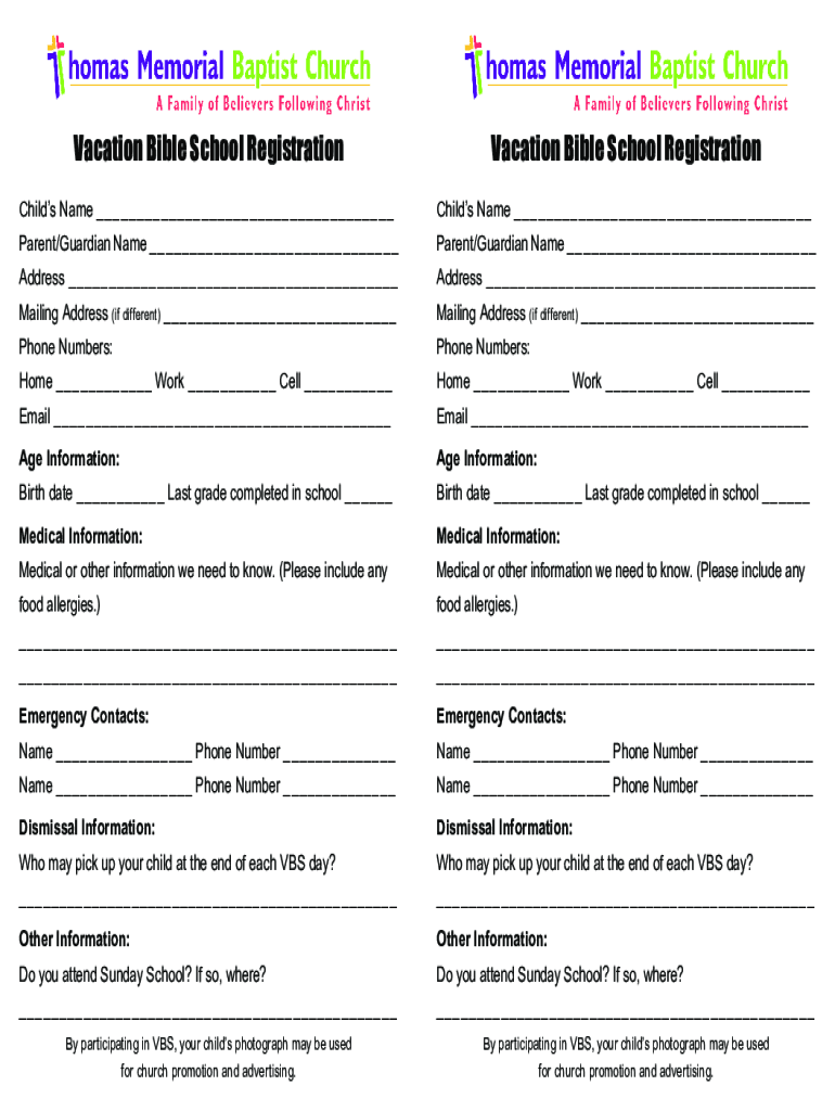 Vacation Bible School RegistrationVacation Bible School RegistrationChilds Name ___Child's Name ___Parent/Guardian Name ___Parent/Guardian Name ___Address ___Address ___Mailing Address (if different)