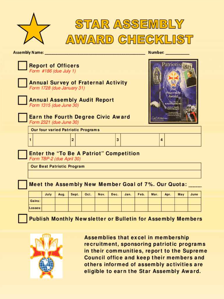 Assembly Name: ___ Number: ___Report of Officers Form #186 (due July 1)Annual Survey of Fraternal Activity Form 1728 (due January 31)Annual Assembly Audit Report Form 1315 (due June 30)Earn the Fourth