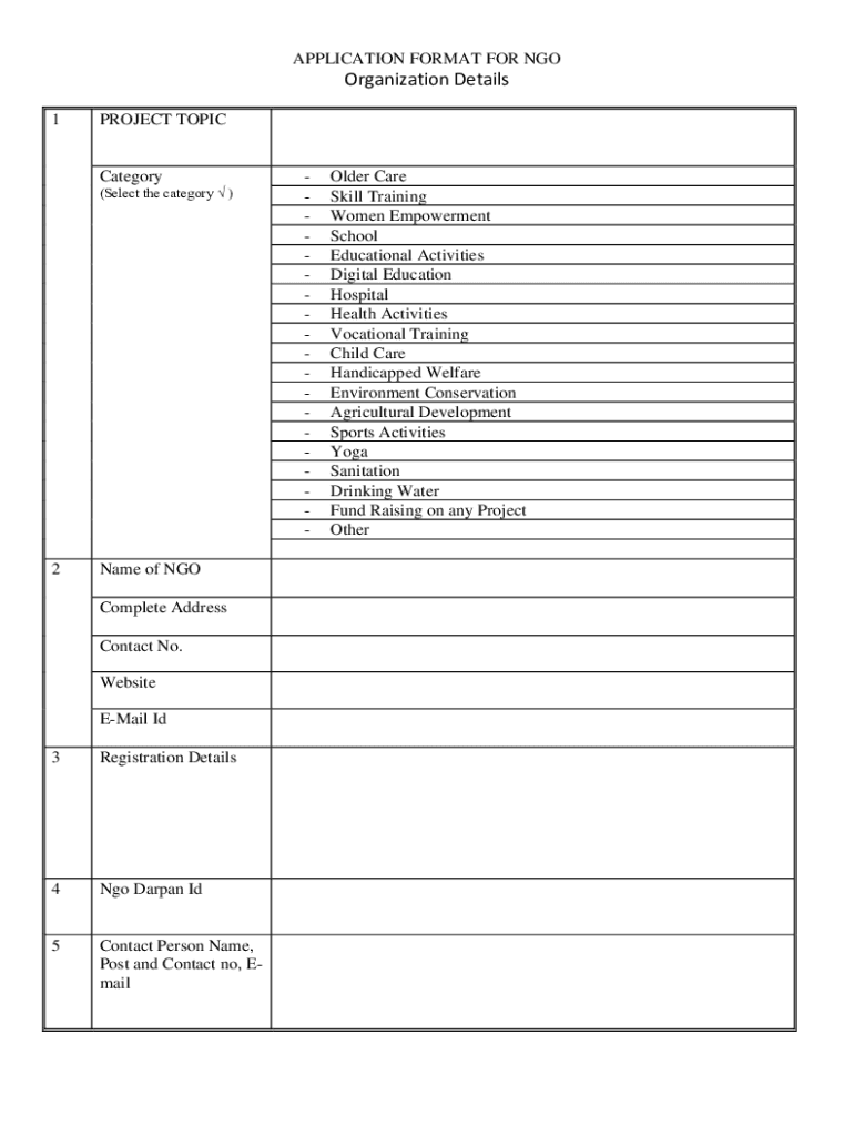 APPLICATION FORMAT FOR Organization Details 1PROJECT TOPICCategory (Select the category)2Name of NGO Complete Address Contact No. Website Email Id3Registration Details4Ngo DARPA Id5Contact Person
