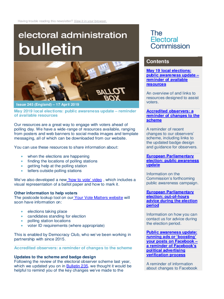 Having trouble reading this newsletter? View it in your browser. Contents May 19 local elections: public awareness update reminder of available resourcesIssue 245 (England) 17 April 2019May 2019 local