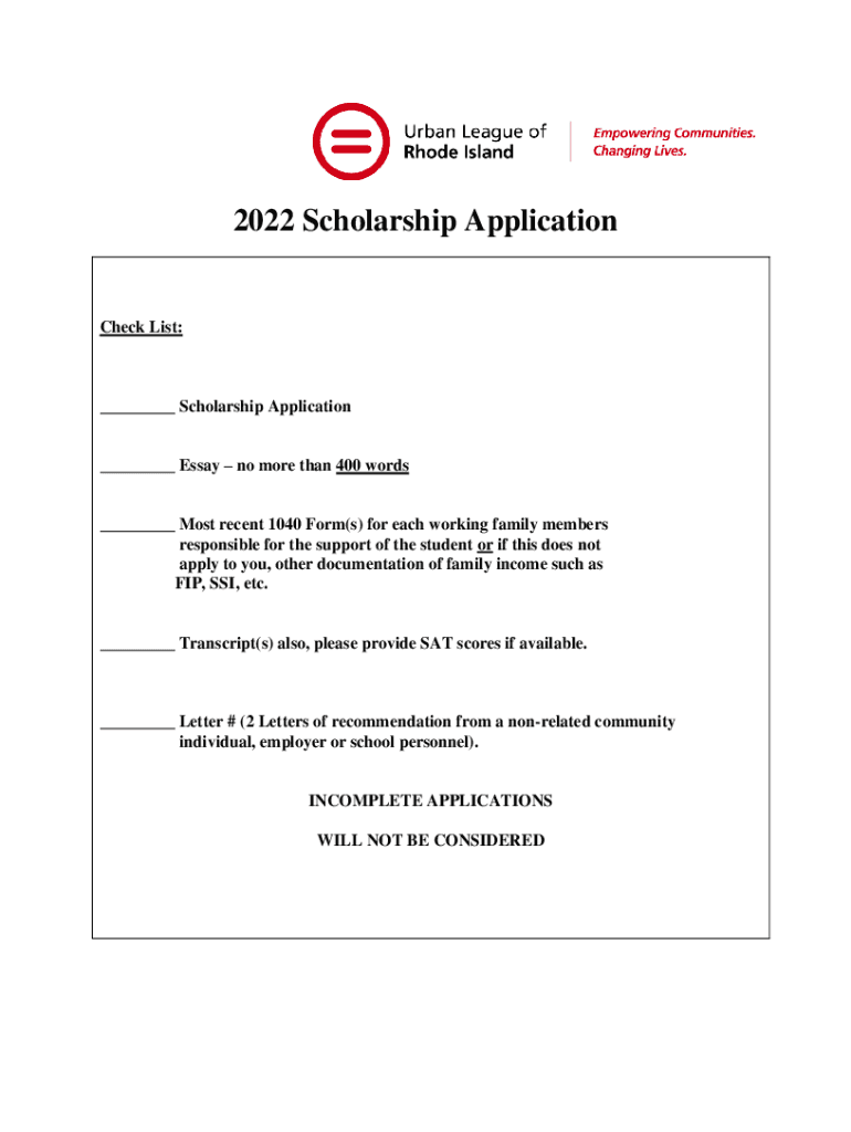 2022 Scholarship ApplicationCheck List:___ Scholarship Application ___ Essay no more than 400 words___ Most recent 1040 Form(s) for each working family members responsible for the support of the student