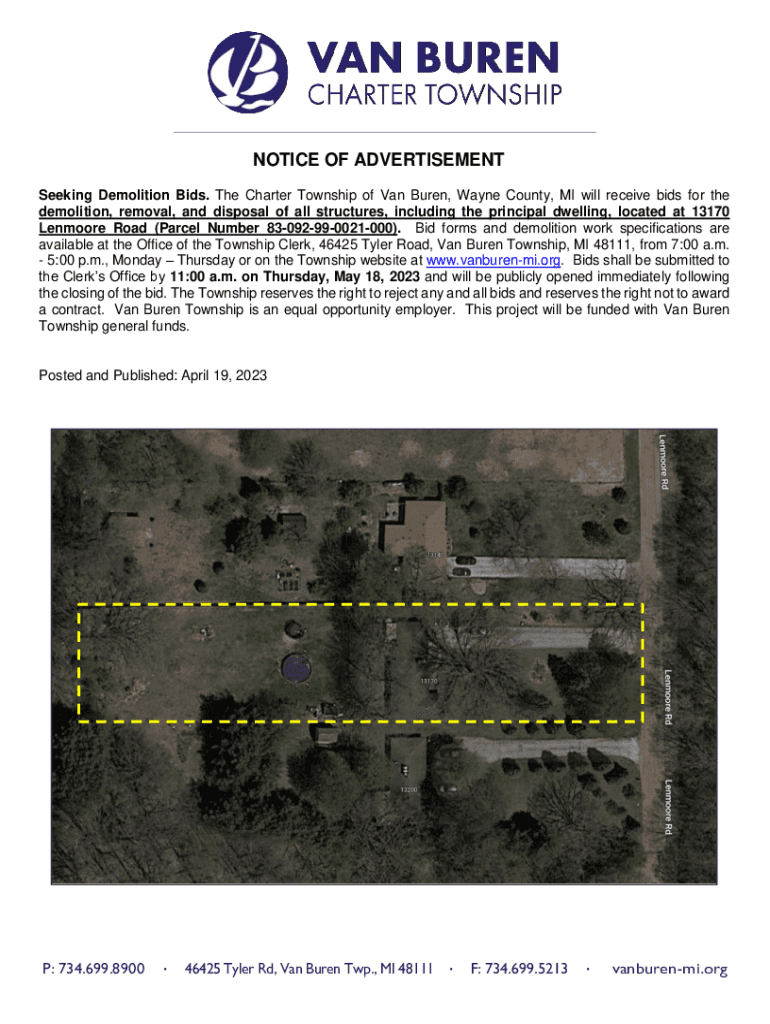 NOTICE OF ADVERTISEMENT Seeking Demolition Bids. The Charter Township of Van Buren, Wayne County, MI will receive bids for the demolition, removal, and disposal of all structures, including the principal
