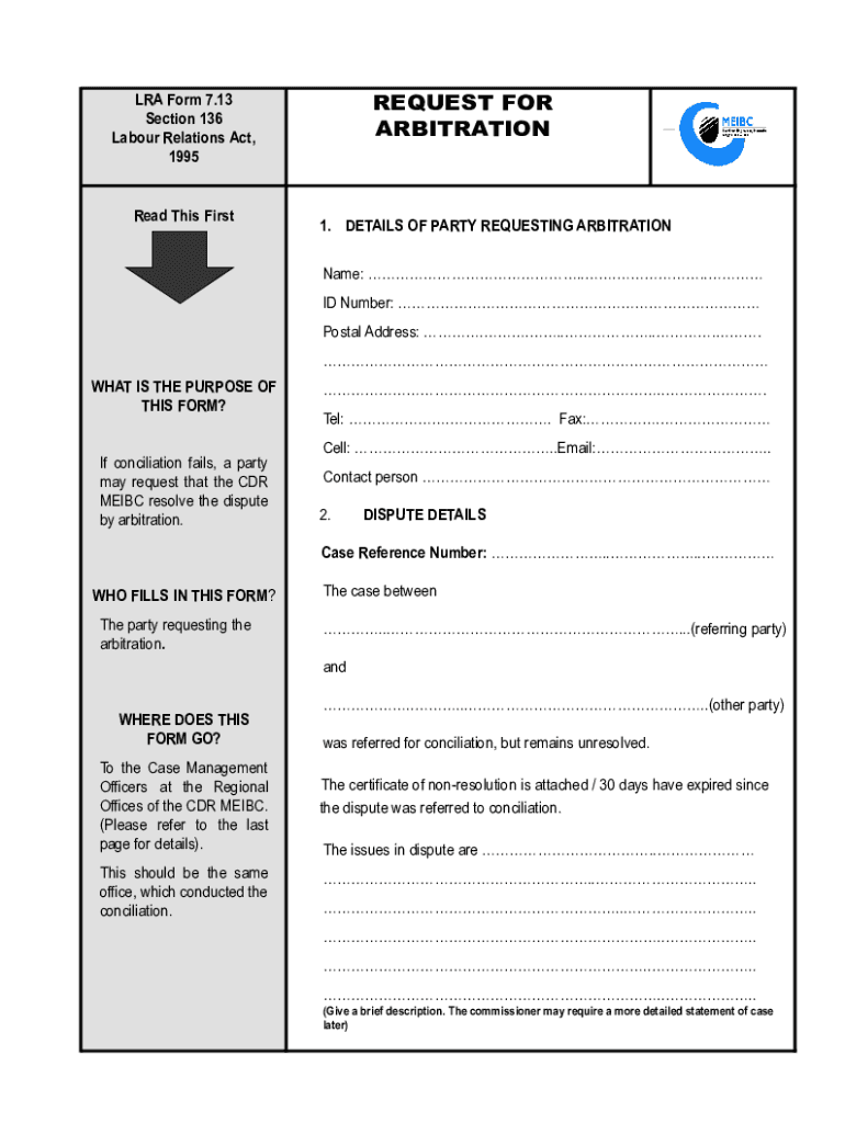 ERA Form 7.13 Section 136 Labor Relations Act, 1995Read This FirstREQUEST FOR ARBITRATION1. DETAILS OF PARTY REQUESTING ARBITRATION Name: ..... ID Number: Postal Address: ........ WHAT