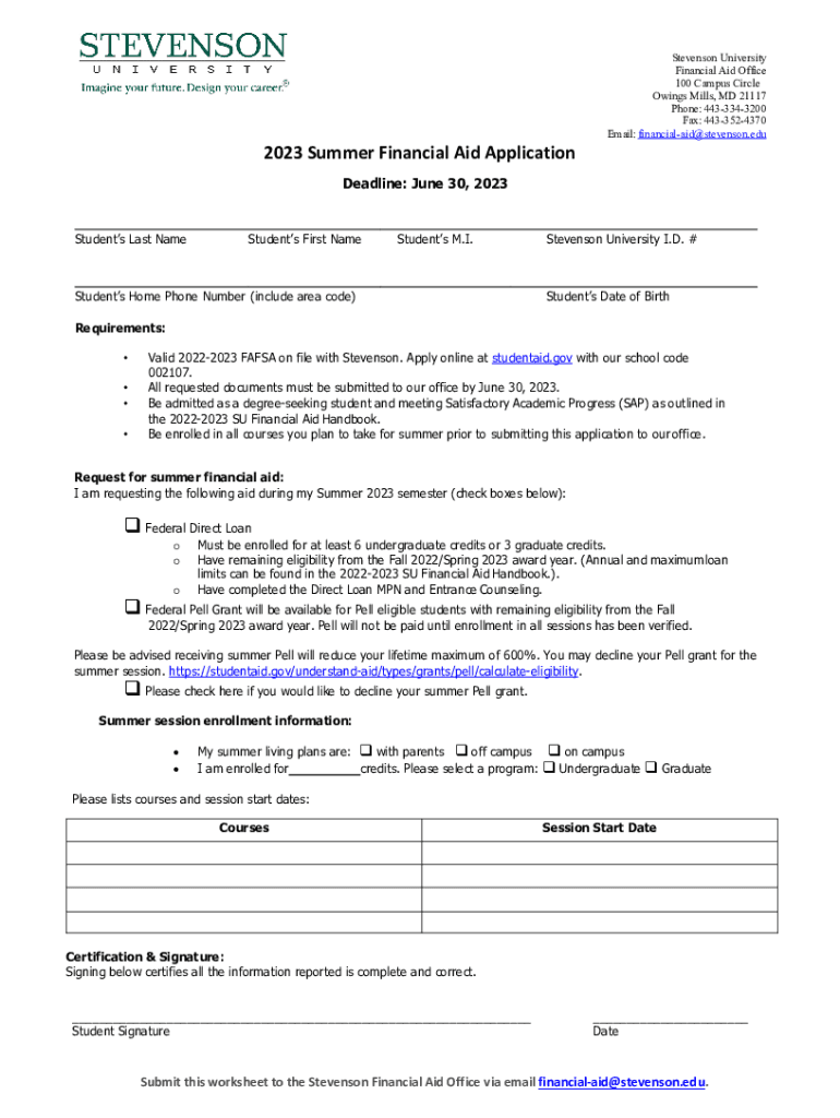 2023 Summer Financial Aid Application Stevenson University Financial Aid Office 100 Campus Circle Owings Mills, MD 21117 Phone: 4433343200 Fax: 4433524370 Email: financialaid@stevenson.eduDeadline: