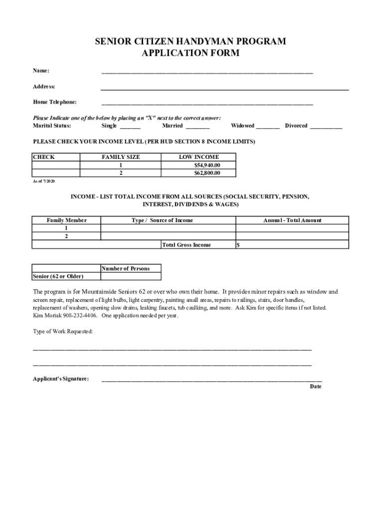 SENIOR CITIZEN HANDYMAN PROGRAM APPLICATION FORM Name:___Address: Home Telephone:___Please Indicate one of the below by placing an \” X\” next to the correct answer: Marital Status: Single ___