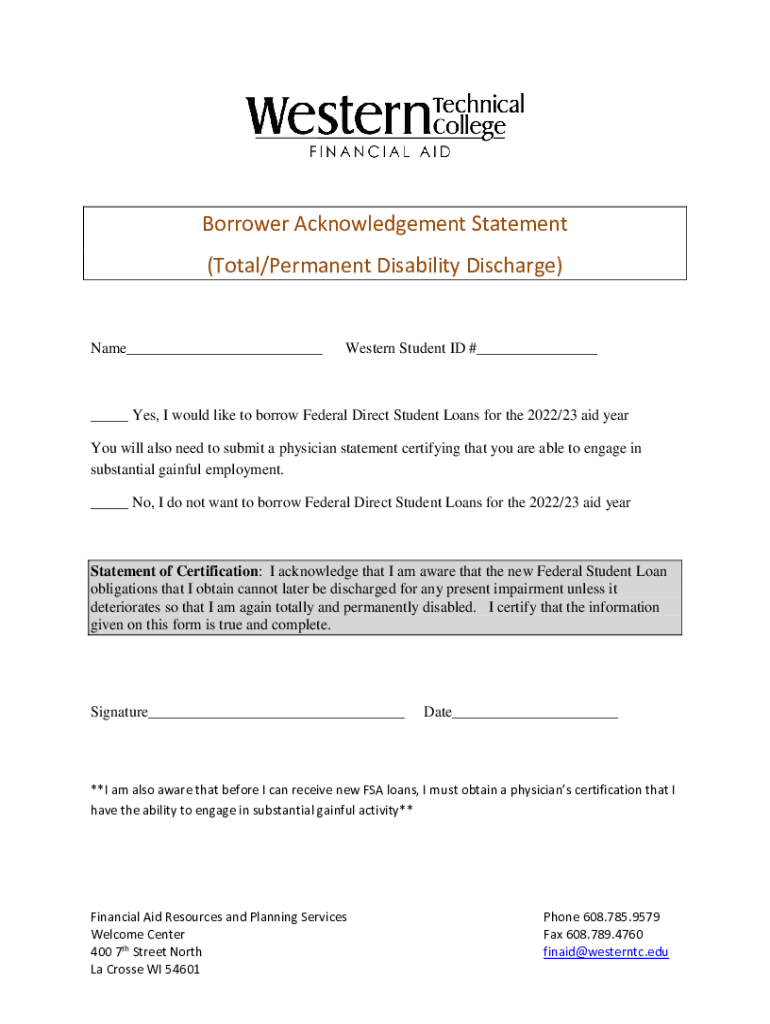 Borrower Acknowledgement Statement (Total/Permanent Disability Discharge)Name___Western Student ID #______ Yes, I would like to borrow Federal Direct Student Loans for the 2022/23 aid year You will