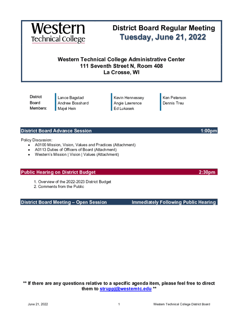 District Board Regular Meeting Tuesday, June n 21, 2 2022 2022Technical college Western Technical College Administrative Center 111 Seventh Street N, Room 408 La Crosse, District Board Members: Members:Lance