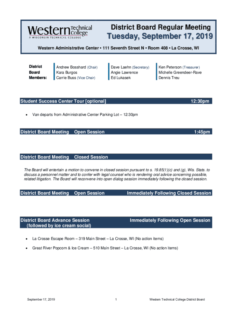District Board Regular Meeting Tuesday, September 17, 2019, Western Administrative Center 111 Seventh Street N Room 408 La Crosse, District Board Members:Andrew Boss hard (Chair) Kara Burgos Carrie