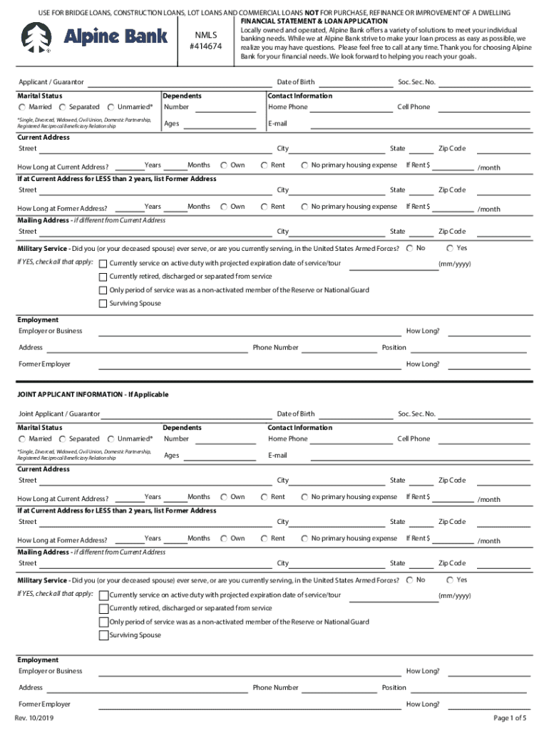 USE FOR BRIDGE LOANS, CONSTRUCTION LOANS, LOT LOANS AND COMMERCIAL LOANS NOT FOR PURCHASE, REFINANCE OR IMPROVEMENT OF A DWELLING FINANCIAL STATEMENT & LOAN APPLICATION Locally owned and operated,