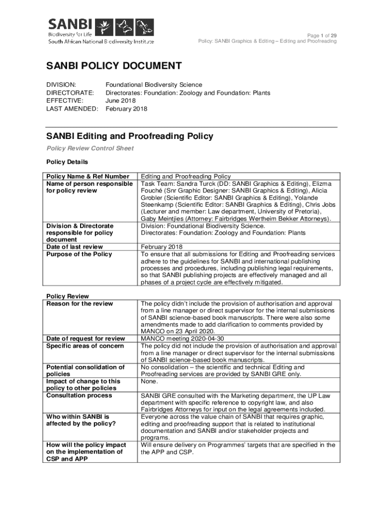 Page 1 of 29 Policy: SAN Graphics & Editing and ProofreadingSANBI POLICY DOCUMENT DIVISION: DIRECTORATE: EFFECTIVE: LAST AMENDED:Foundational Biodiversity Science Directorates: Foundation: Zoology