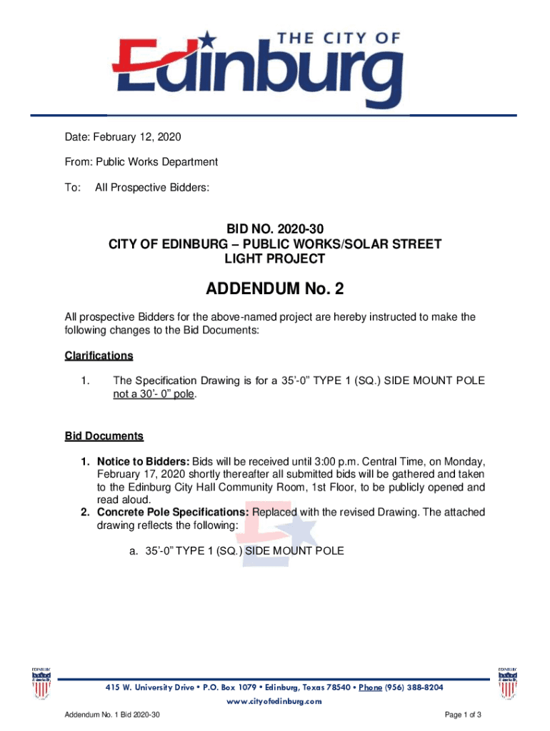 Date: February 12, 2020, From: Public Works Department To:All Prospective Bidders:BID NO. 202030 CITY OF EDINBURG PUBLIC WORKS/SOLAR Streetlight PROJECTADDENDUM No. 2 All prospective Bidders for the