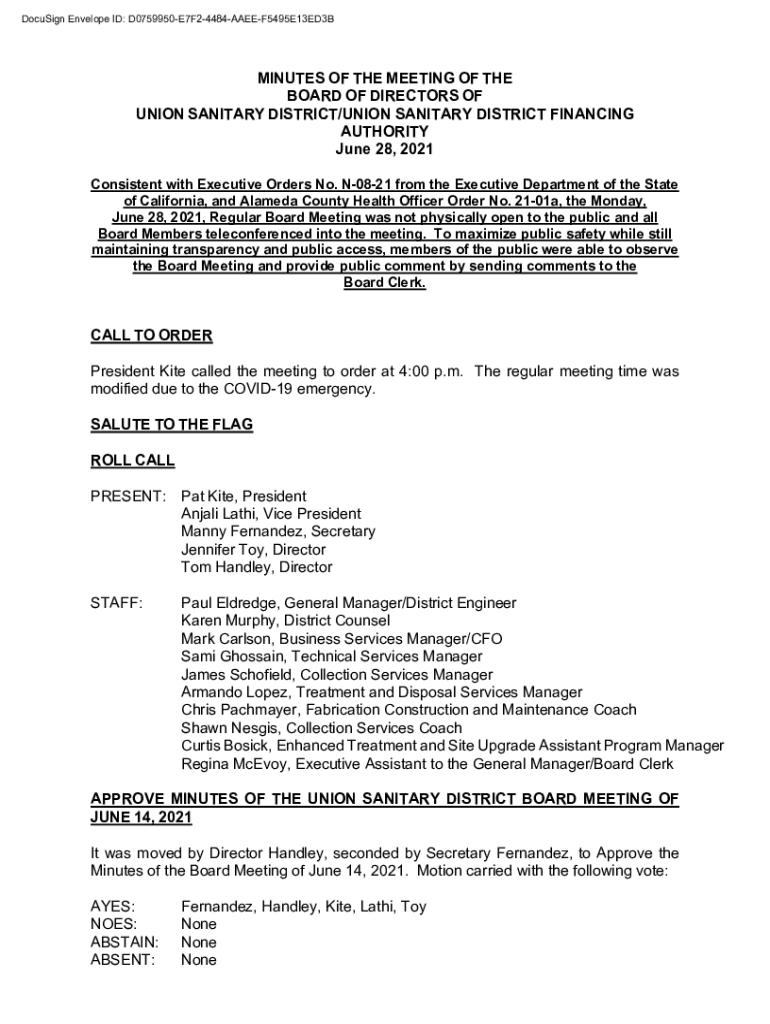 DocuSign Envelope ID: D0759950E7F24484AAEEF5495E13ED3B MINUTES OF THE MEETING OF THE BOARD OF DIRECTORS OF UNION SANITARY DISTRICT/UNION SANITARY DISTRICT FINANCING AUTHORITY June 28, 2021, Consistent