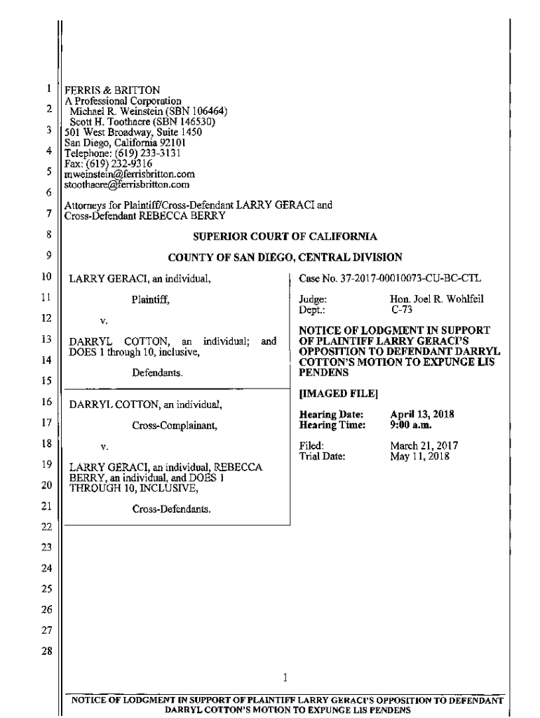 12 34 5FERRIS & BRITTON Professional Corporation Michael R. Weinstein (SON 106464) Scott H. Toothache (SON 146530) 501 West Broadway, Suite 1450 San Diego, California 92101 Telephone: (619) 2333131