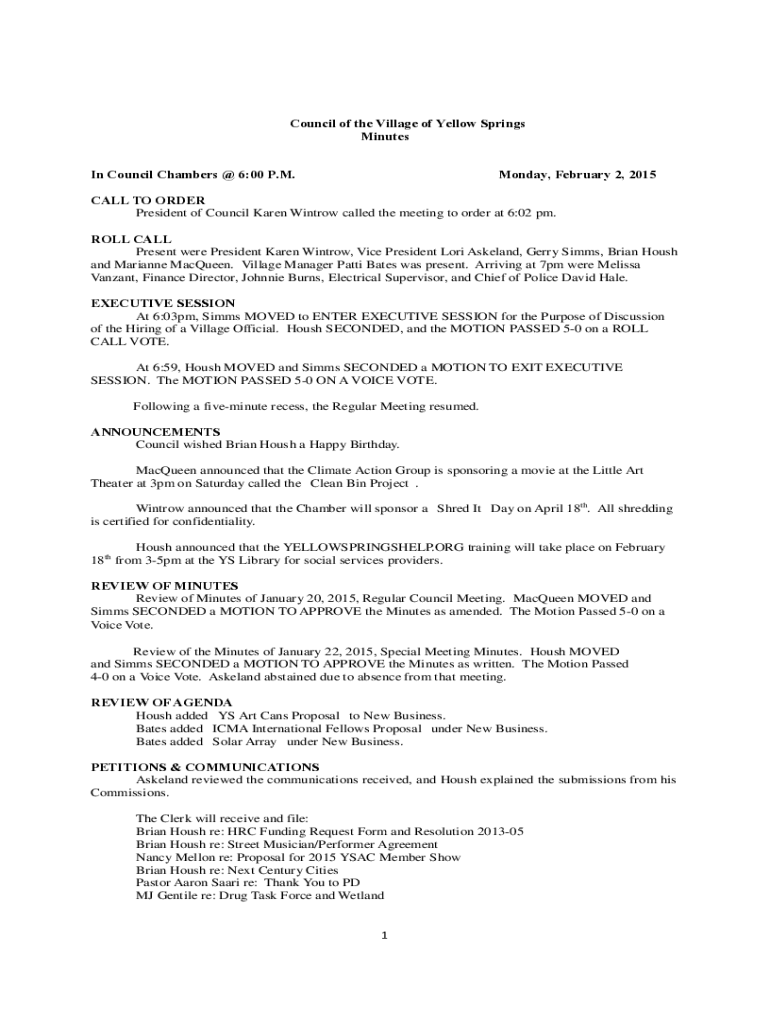 Council of the Village of Yellow Springs Minutes In Council Chambers @ 6:00 P.M.Monday, February 2, 2015CALL TO ORDER President of Council Karen Windrow called the meeting to order at 6:02 pm. ROLL