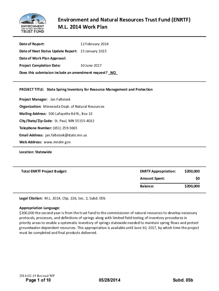 Environment and Natural Resources Trust Fund (EN RTF) M.L. 2014 Work Plan Date of Report:12 February 2014Date of Next Status Update Report: 15 January 2015 Date of Work Plan Approval: Project Completion