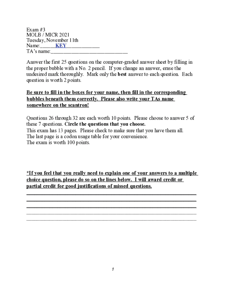 Exam #3 MOB / MICR 2021 Tuesday, November 11th Name:___KEY___ TAS name:___ Answer the first 25 questions on the computer graded answer sheet by filling in the proper bubble with a No. 2 pencil. If