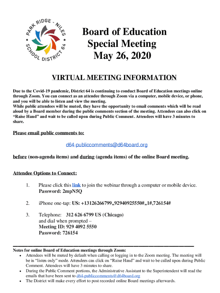 Board of Education Special Meeting May 26, 2020, VIRTUAL MEETING INFORMATION Due to the COVID-19 pandemic, District 64 is continuing to conduct Board of Education meetings online through Zoom. You