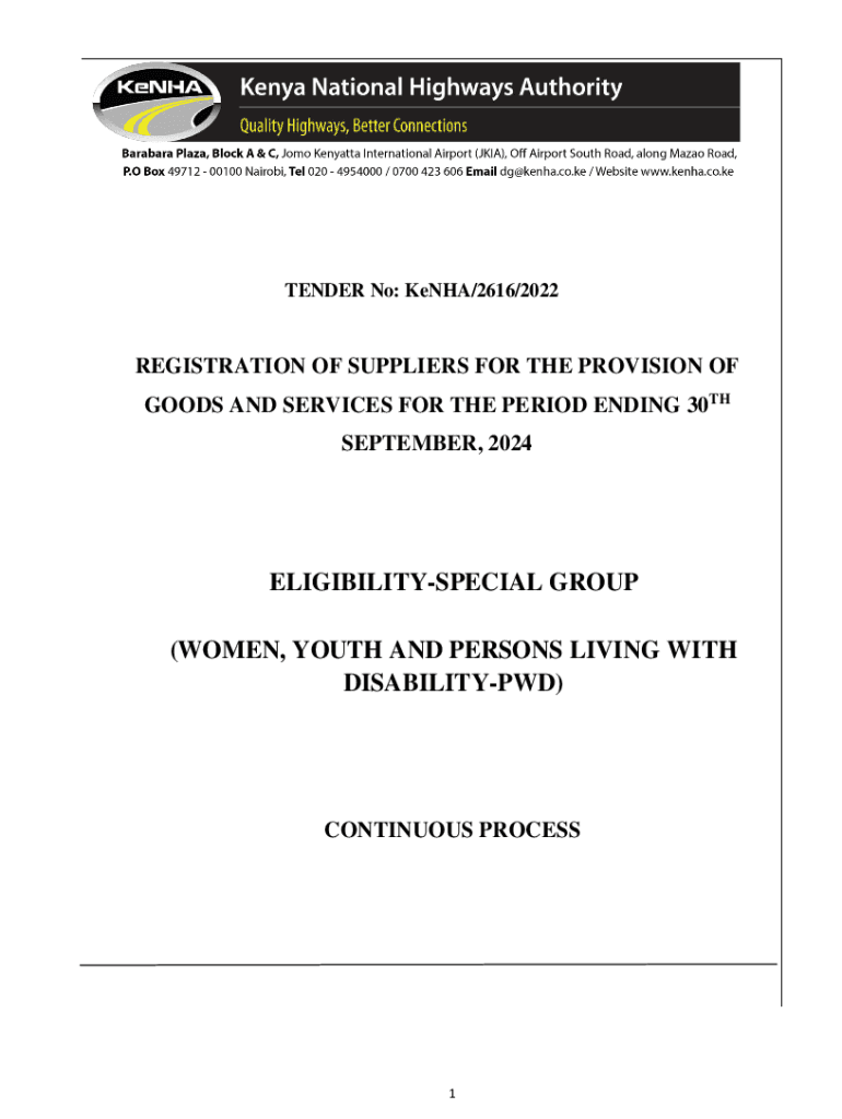 TENDER No: Kenya/2616/2022REGISTRATION OF SUPPLIERS FOR THE PROVISION OF GOODS AND SERVICES FOR THE PERIOD ENDING 30TH SEPTEMBER, 2024ELIGIBILITYSPECIAL GROUP (WOMEN, YOUTH AND PERSONS LIVING WITH