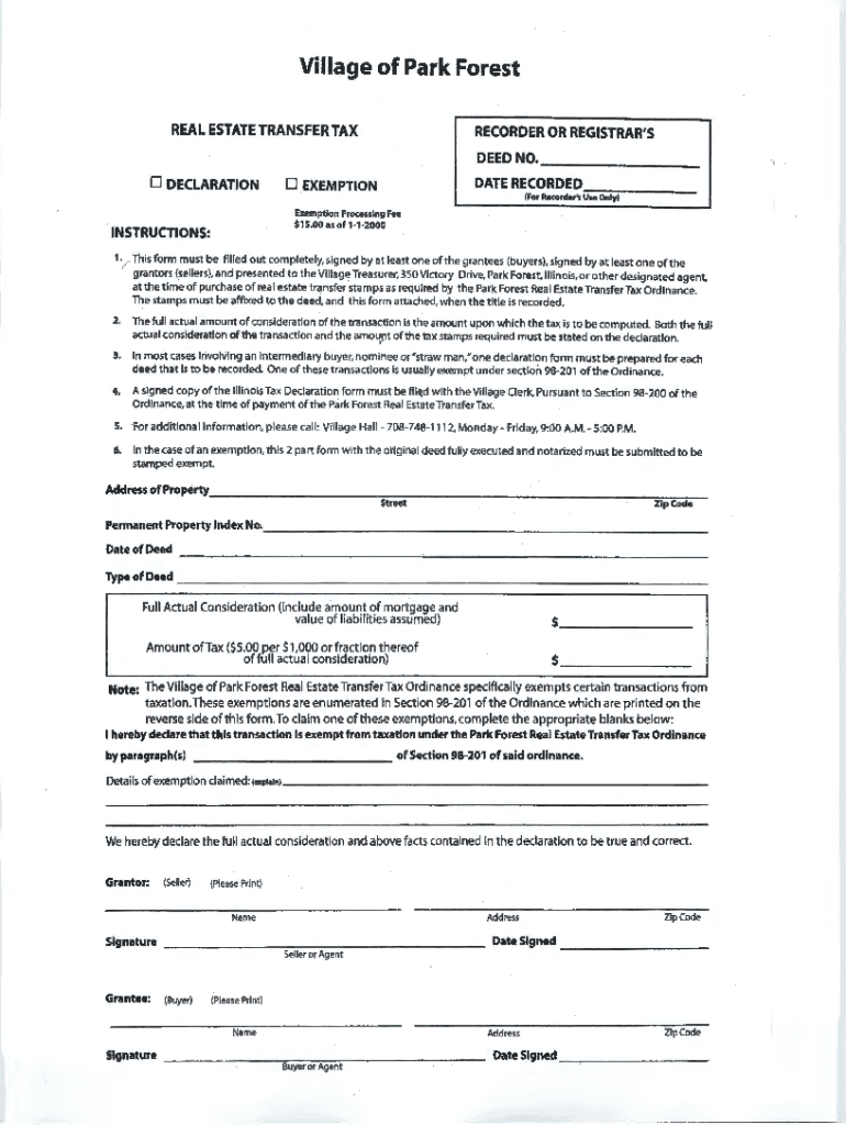 Village of Park Forest REAL ESTATE TRANSFER RECORDER OR REGISTRAR\'S DEED NO. _ _ _ _ _ _ __0 DECLARATIONDATERECORDED0 Exemption Recorder\'s Use Only)Exemption Processing Fee $15.00 as of 112000INSTRUCTIONS: