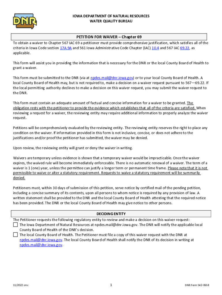 IOWA DEPARTMENT OF NATURAL RESOURCES WATER QUALITY BUREAUPETITION FOR WAIVER Chapter 69 To obtain a waiver to Chapter 567 IAC 69 a petitioner must provide comprehensive justification, which satisfies