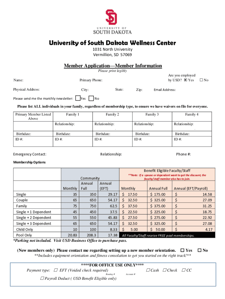 University of South Dakota Wellness Center 1031 North University Vermilion, SD 57069Member ApplicationMember Information Please print legibly Name: Click or tap here to enter text. Primary Phone: