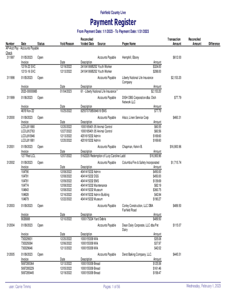 Fairfield County Repayment Register From Payment Date: 1/1/2023 To Payment Date: 1/31/2023 Number Date Status Apart Pay Accounts Payable Check 311997 01/05/2023 Open Invoice 12/1922 SVC 12/1316 SVC