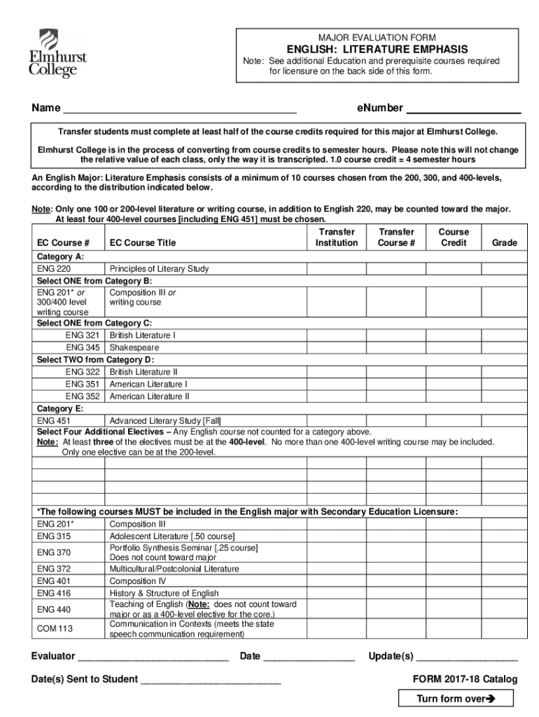 MAJOR EVALUATION non-English: LITERATURE EMPHASIS Note: See additional Education and prerequisite courses required for licensure on the back side of this form.c number ___Name ___Transfer students
