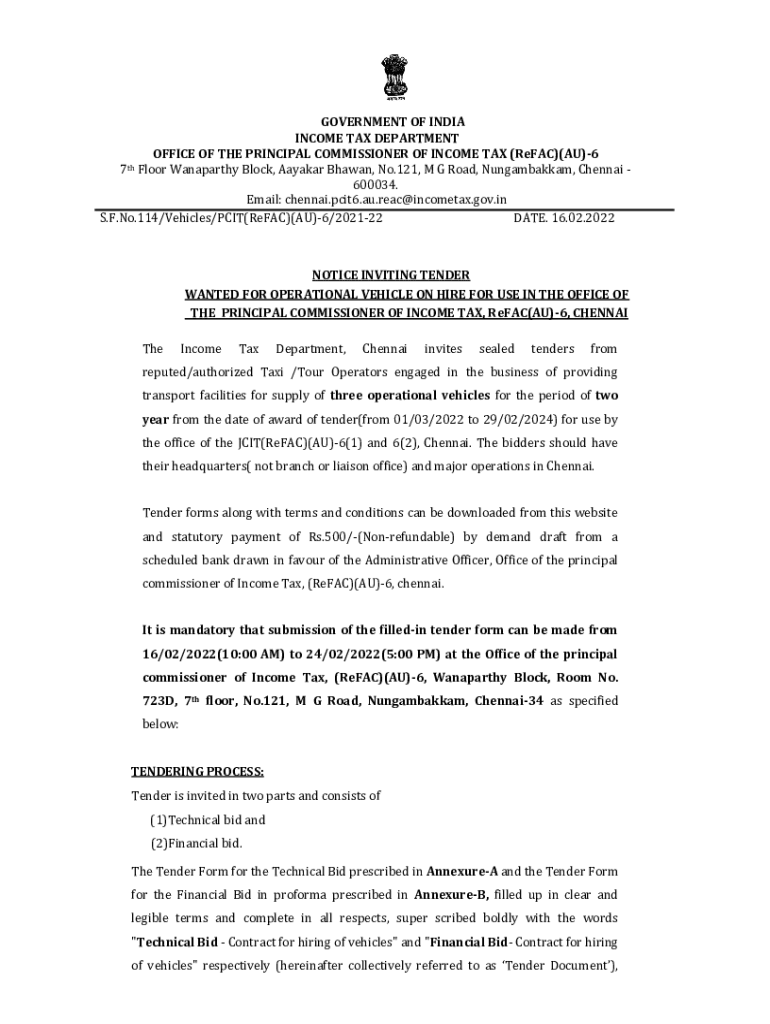 GOVERNMENT OF INDIA INCOME TAX DEPARTMENT OFFICE OF THE PRINCIPAL COMMISSIONER OF INCOME TAX (Reface)(AU)6 7th Floor Wanaparthy Block, Avatar Shawn, No.121, M G Road, Nungambakkam, Chennai 600034.