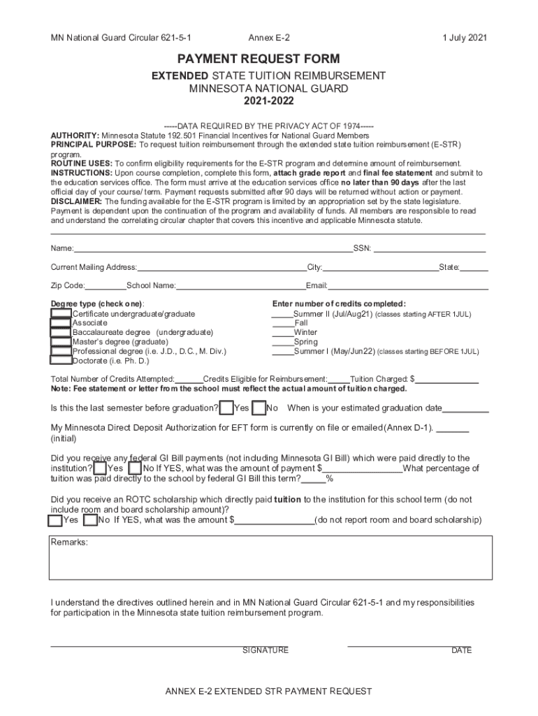 MN National Guard Circular 62151Annex E21 July 2021PAYMENT REQUEST FORM EXTENDED STATE TUITION REIMBURSEMENT MINNESOTA NATIONAL GUARD 20212022 DATA REQUIRED BY THE PRIVACY ACT OF 1974AUTHORITY: Minnesota