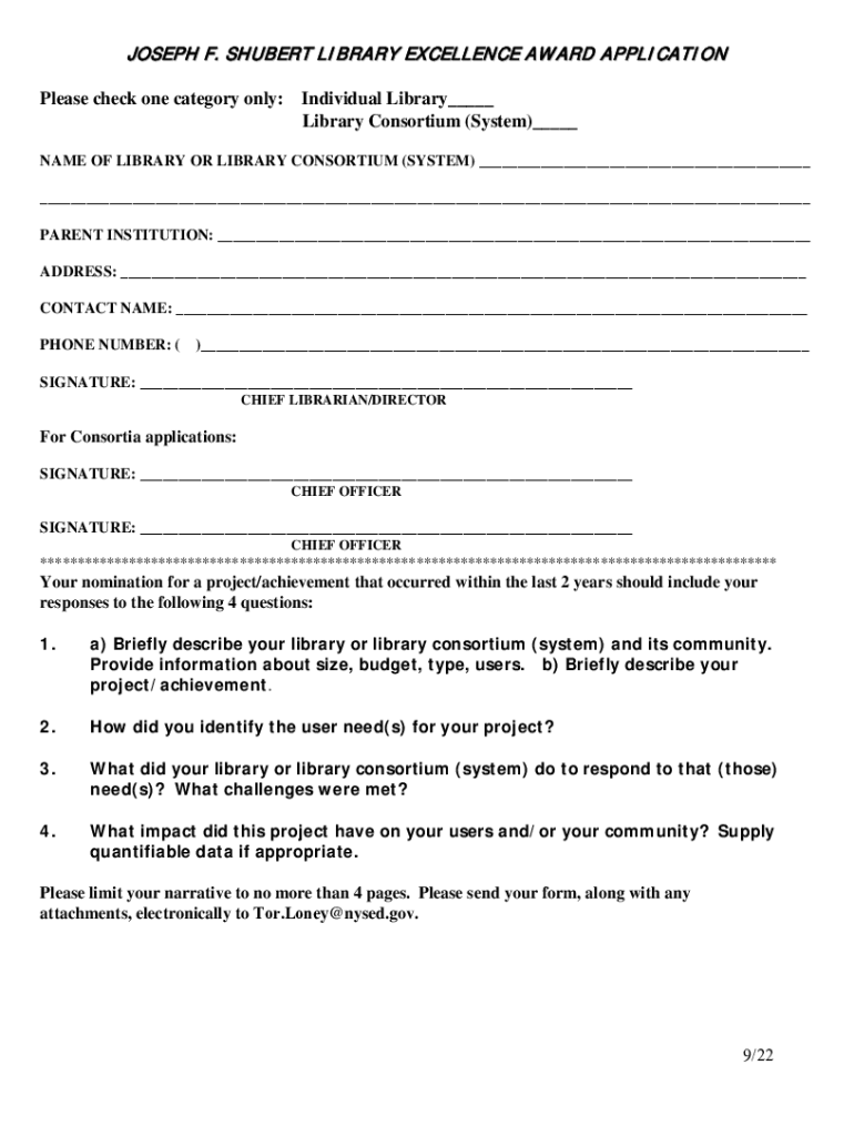 J O S E P H F. S H U B E R T L I B R A R Y E × C E L L E N C E A W A R D A P P L I C A TI O N Please check one category only:Individual Library___ Library Consortium (System)___NAME OF LIBRARY OR