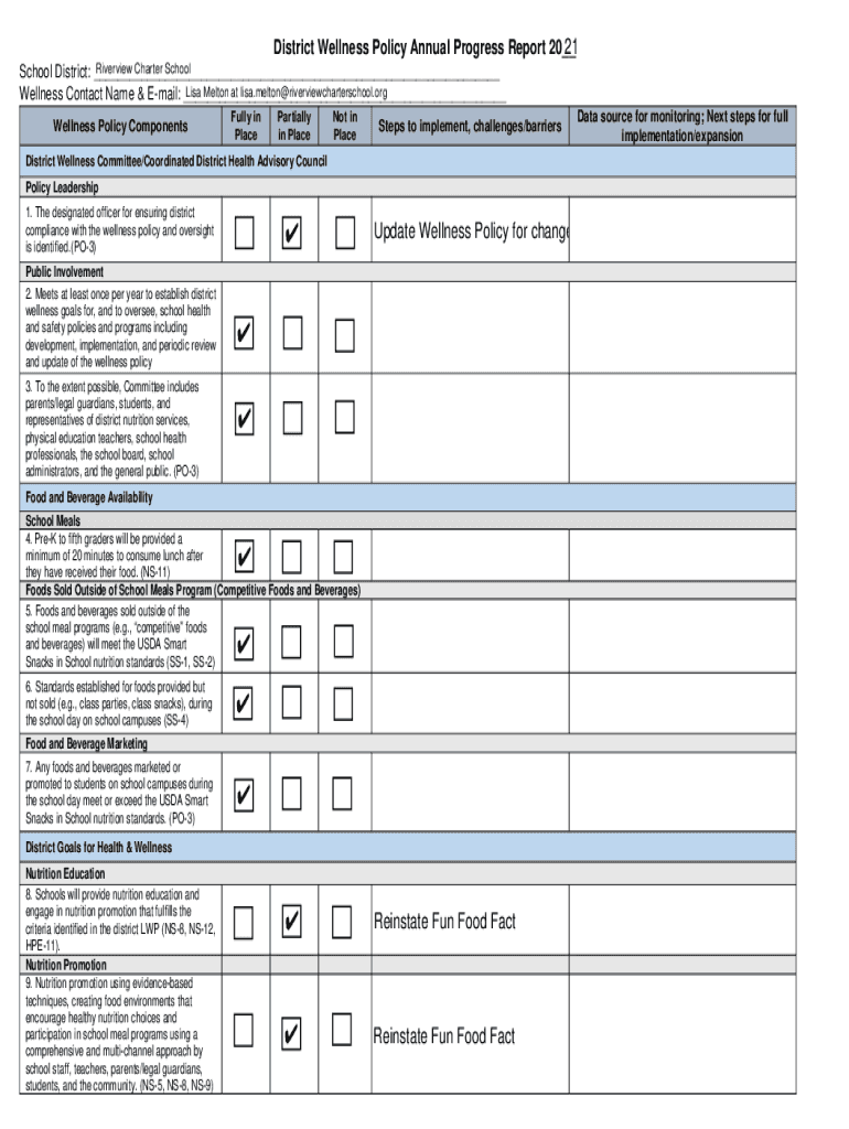 District Wellness Policy Annual Progress Report 20__ 21 Riverview Charter School District: ___ Lisa Melton at lisa.melton@riverviewcharterschool.org Wellness Contact Name & Email: ___Wellness Policy