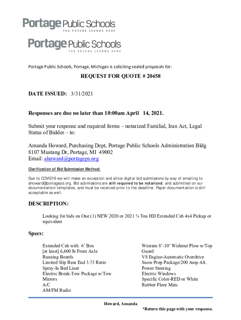 PortagePublicSchools, Portage, Michiganissolicitingsealedproposalsfor:REQUEST FOR QUOTE # 20458 DATE ISSUED: 3/31/2021 Responses are due no later than 10:00am April 14, 2021. Submit your response