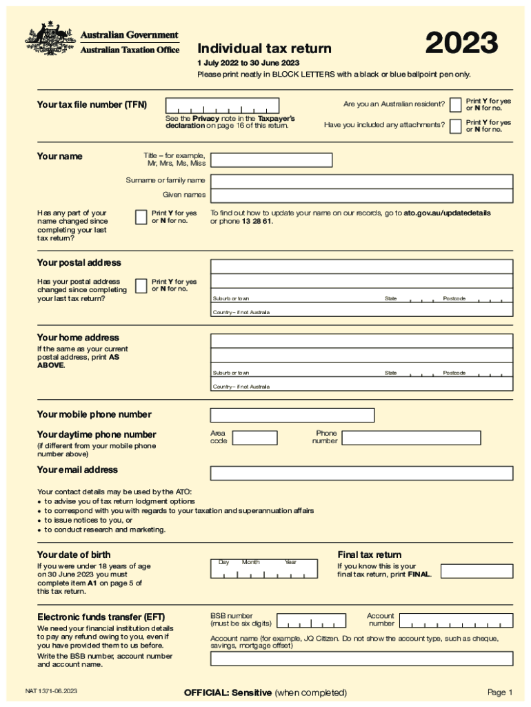 2023Individual tax return1 July 2022 to 30 June 2023Please print neatly in BLOCK LETTERS with a black or blue ballpoint pen only. Are you an Australian resident? Print Y for yes or N for no. Have