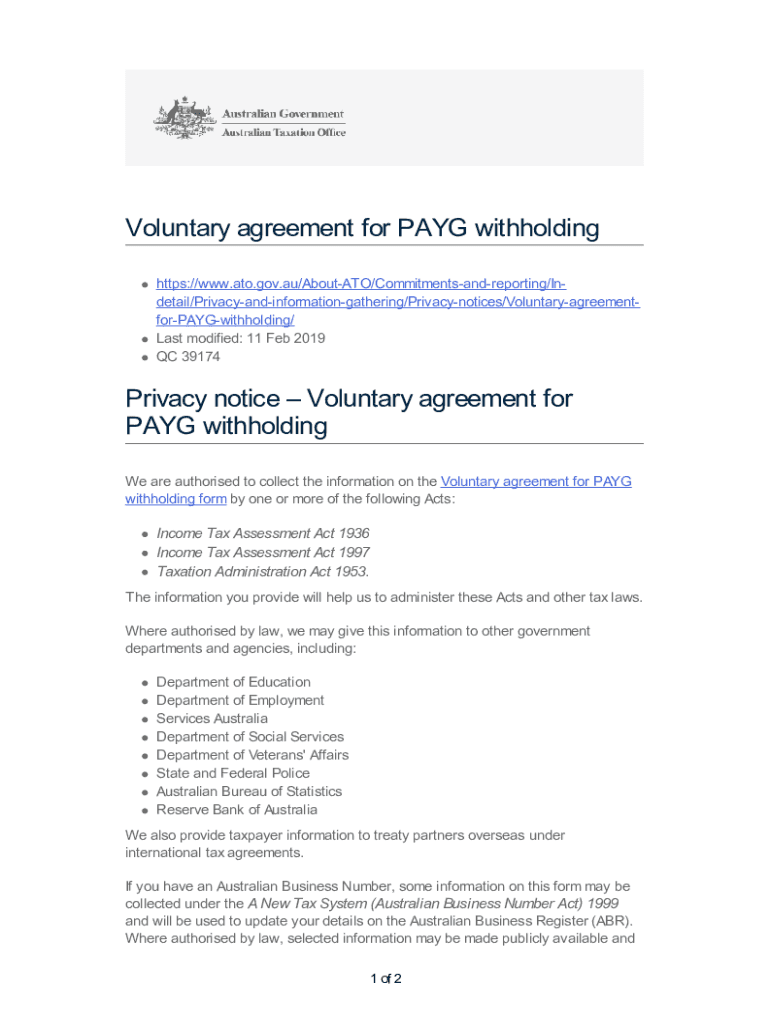 Voluntary agreement for PAY withholding https://www.ato.gov.au/AboutATO/Commitmentsandreporting/Indetail/Privacyandinformationgathering/Privacynotices/VoluntaryagreementforPAYGwithholding/ Last modified: