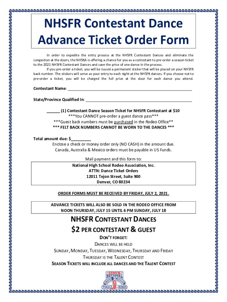 Get the free NHSFR Contestant Dance Advance Ticket Order Form