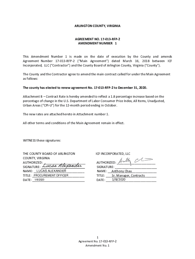 ARLINGTON COUNTY, VIRGINIAAGREEMENT NO. 17013RFP2 AMENDMENT NUMBER 1This Amendment Number 1 is made on the date of execution by the County and amends Agreement Number 17013RFP2 (Main Agreement) dated