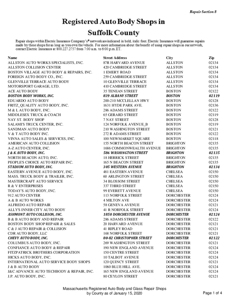 Name ALSTON AUTO WORKS SPECIALISTS, INC. ALSTON COLLISION CENTER BOSTON VILLAGE AUTO BODY & REPAIRS, INC. FOREIGN AUTO BODY CO., INC. GRENVILLE TERRACE AUTO BODY MOTORSPORT GARAGE, LTD. ACE AUTO BODY