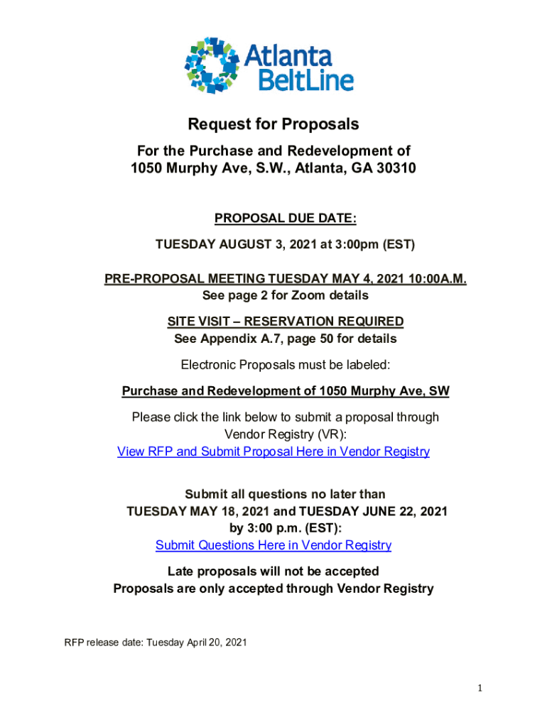 Request for Proposals For the Purchase and Redevelopment of 1050 Murphy Ave, S.W., Atlanta, GA 30310 PROPOSAL DUE DATE: TUESDAY, AUGUST 3, 2021, at 3:00pm (EST) PROPOSAL MEETING TUESDAY, MAY 4, 2021